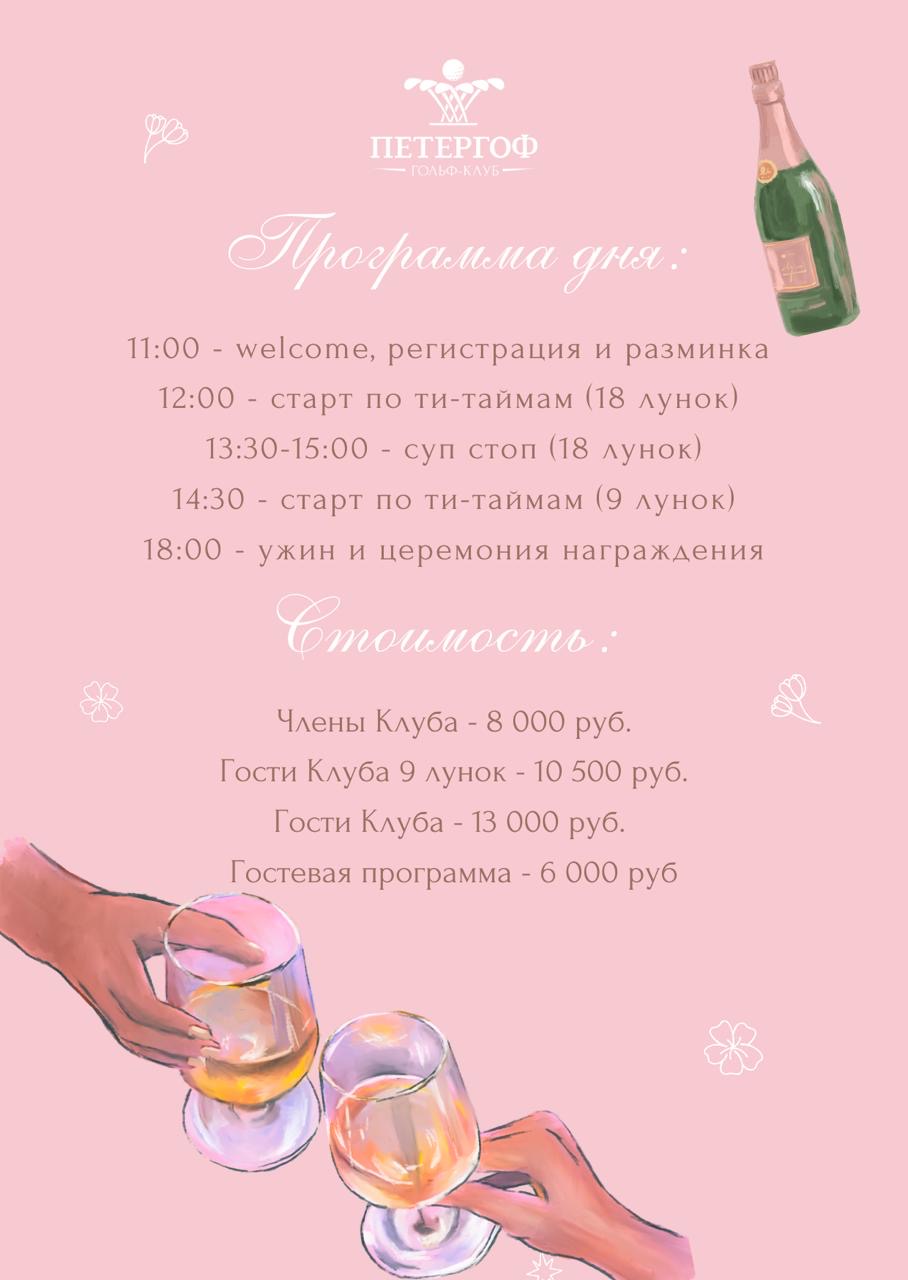 Это отличный шанс не только поиграть в гольф, но и познакомиться с новой леди-капитаном, провести целый день в прекрасной женской компании, с шампанским, караоке, вкусной едой и видами на красивейшее поле «Петергофа». И, конечно, не забудем поблагодарить нашу предыдущую леди-капитана за прекрасные гольф-сезоны.