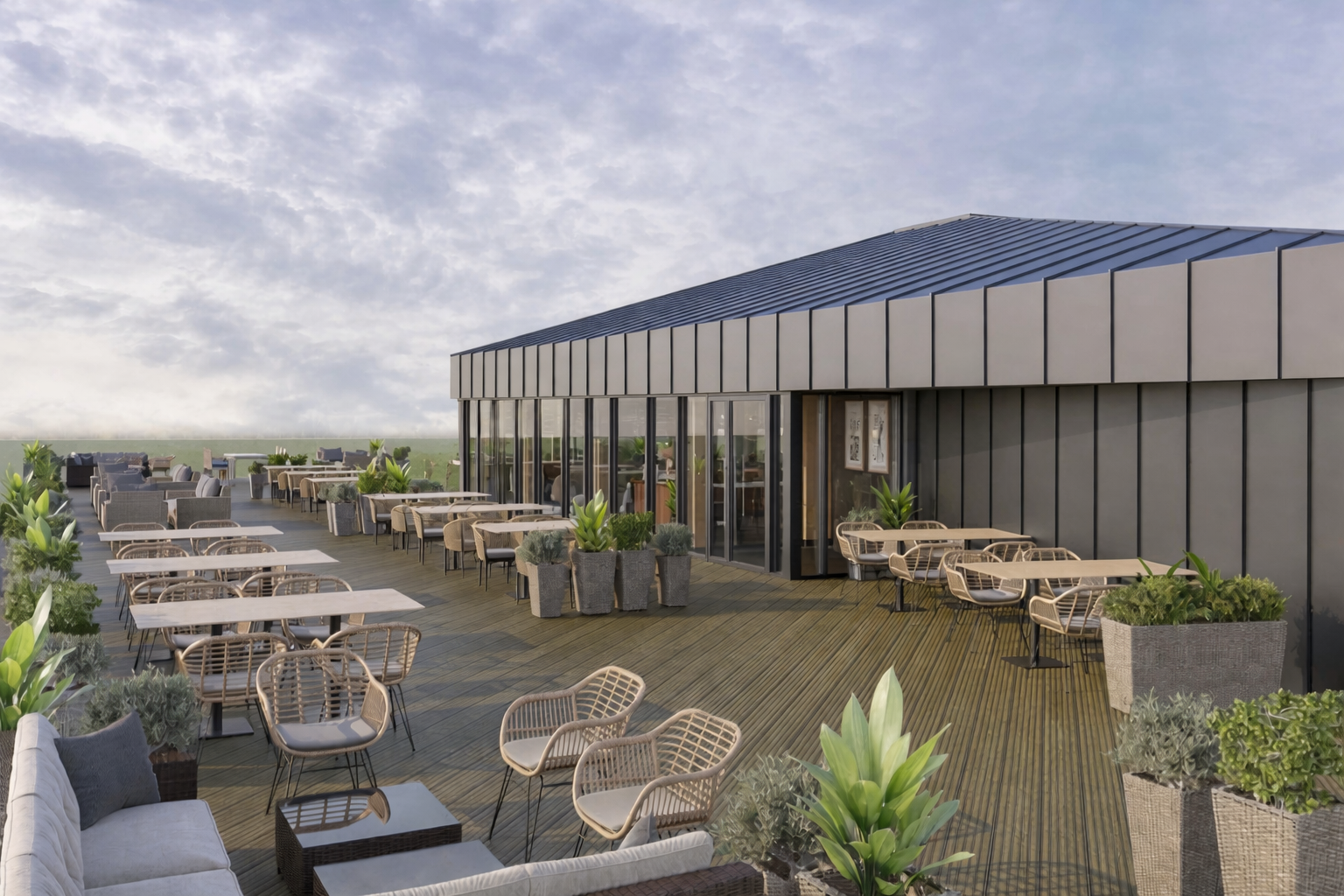 Атмосферу будущего пространства уже можно увидеть на рендерах — они передают лёгкость, природную эстетику и главное преимущество ресторана: открытую террасу с видом на зелёное поле гольф-клуба.