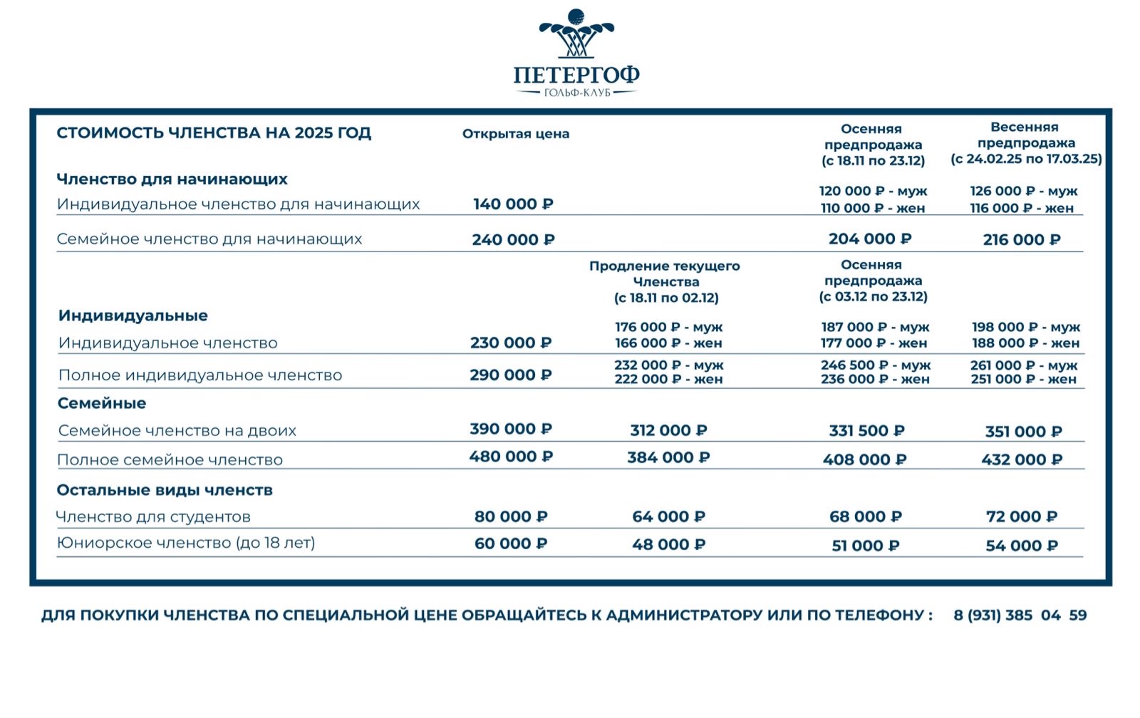 Если вы заинтересовались нашим специальным предложением или у вас возникли вопросы, просим связаться с ресепшен гольф-клуба по телефону - 8 931 385 04 59